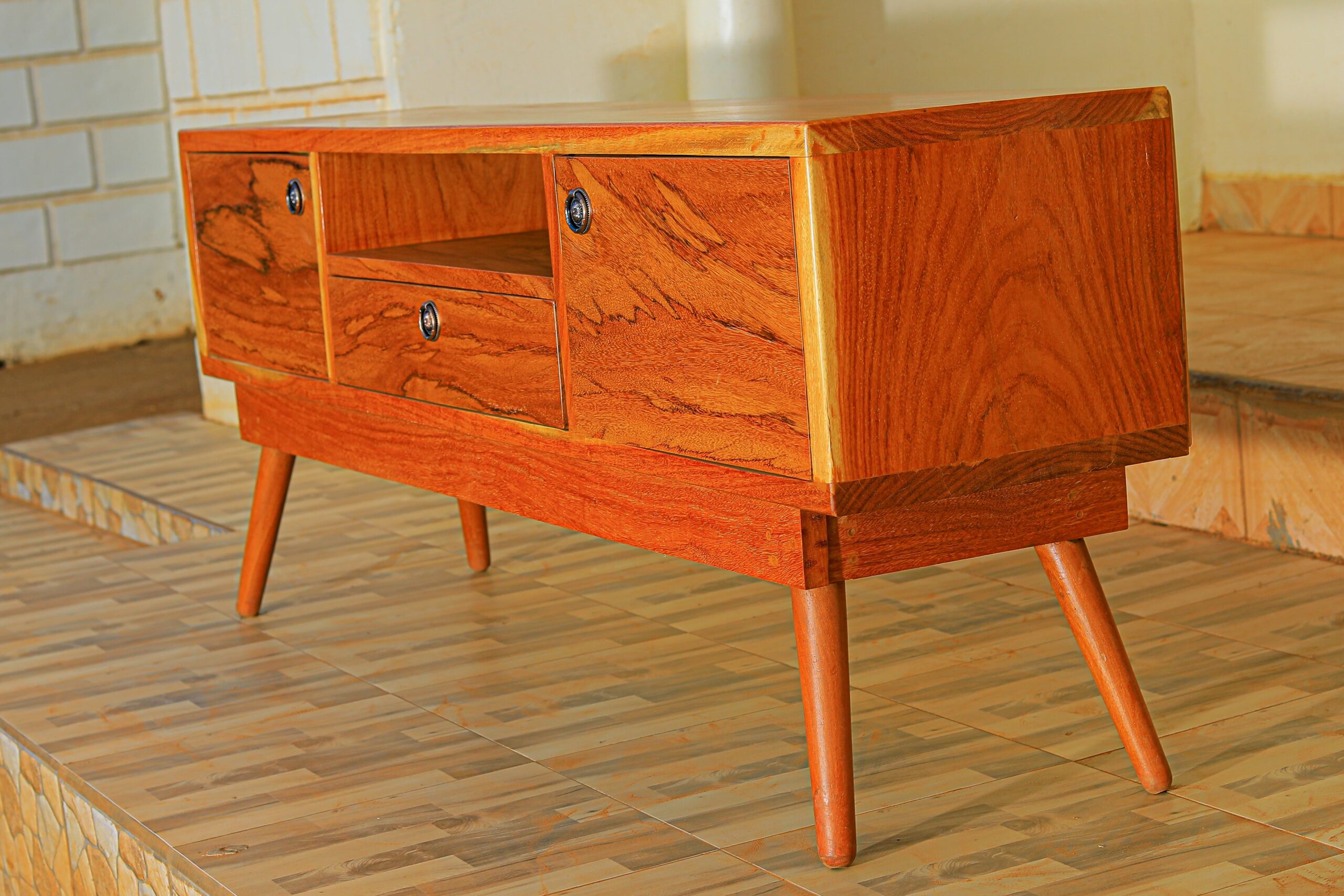 A sleek, low-profile TV stand handcrafted from solid wood. Closed side doors add rich texture, while twin open center shelves keep decoders and consoles easy to access. Finished in a warm natural tone and set on tapered legs for a light, modern look that suits any living room.