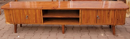 Bring natural warmth and clean design to your entertainment space. This long, low media console features a spacious top for large screens, two enclosed side cabinets with reeded/fluted fronts, and a double open shelf in the center for everyday devices. Subtle rounded edges and mid-century tapered legs keep the silhouette airy, while the hand-finished wood surface celebrates unique grain patterns – no two pieces are exactly alike.